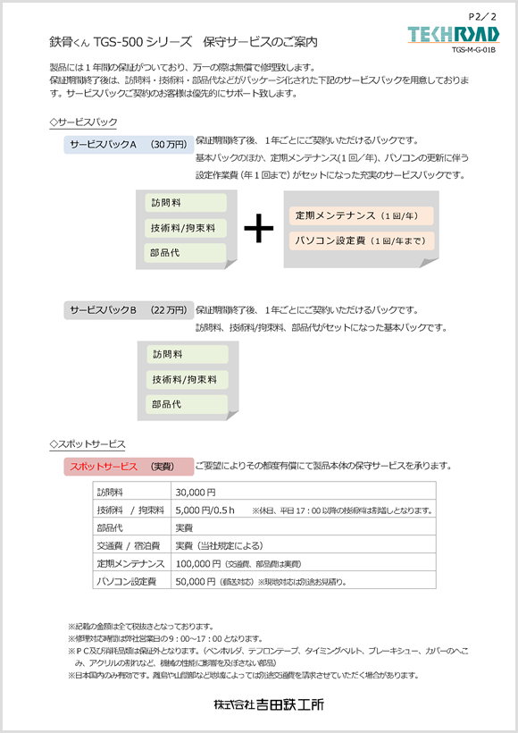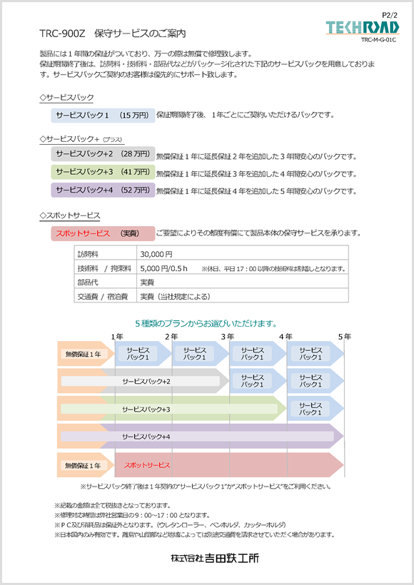 弊社では、購入後の保証期間が過ぎたユーザー様にも安心して御利用頂くために「サービスパック」をご用意しております。規定の期間を所定の保守料金をお支払いいただき、保守サービスを実施する方式です。サービスパック未加入の場合はスポットサービスとなり、修理を行う場合にはかかる費用全ての規定料金を請求させて頂きます。詳細につきましてはお問い合わせください。